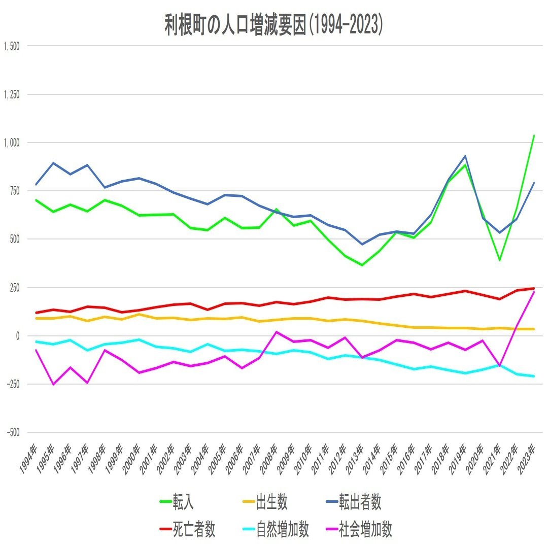 まず、転出と転入の社会増減から見てみますと、まれに社会増となっている年(2008年、2022年、2023年)がありますが、全体としては町を出ていく人のほうが多い状況です。特に2022年と2023年は社会増となっていますが、実際に増えたのは外国人だけで日本人は減っています。理由はどうあれ利根町より他所の場所の方が良いと考える人が多かったというのは事実でしょう。